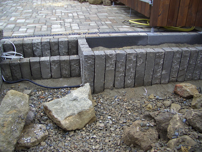 Terrasse aus Sandsteinplatten mit Kleinpflastereinfassung