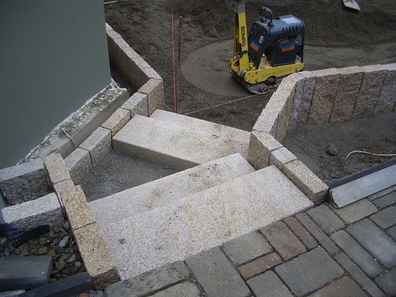 Treppenanlage aus Granitstufen passend mit Palisaden eingefasst